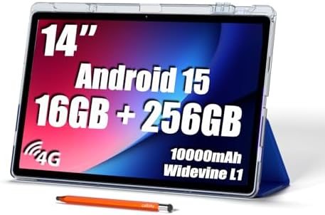 14 inch Large Screen Tablet, Android 15 Tablet 16GB RAM 256GB ROM, 1920 * 1200 IPS FHD Display, Widevine L1, 10000mAh 18W Charging, Wi-Fi & Bluetooth, 4G LTE, with Stand Case & Stylus