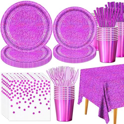 161Demon Hunter Holographic Laser Tablewares Kit, Pink Sparkling Iridescent Grad Decor for 20 Guests-Purple Party Supplies Paper Plates Napkins Cups Cultery for Birthday Wedding Graduation Bachelor