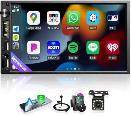 7 inch Double Din Car Stereo with Wireless Apple CarPlay, Android Auto Car Radio, Bluetooth 5.2, IPS 1024 * 600 Touchscreen, Backup Camera, FM Radio,Dual USB/Fast Charging/Subwoofer/Car Play