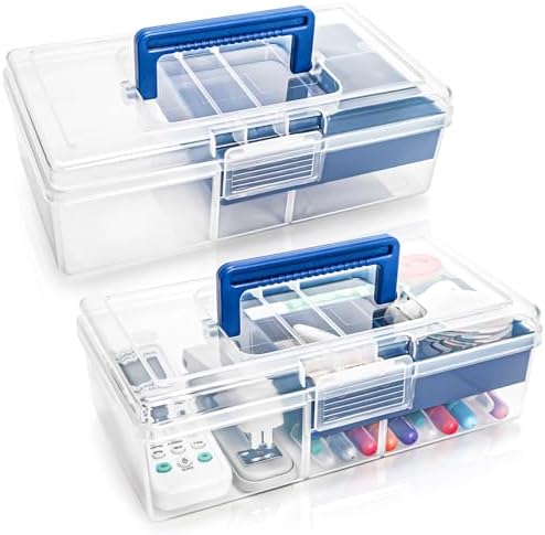 Elsjoy 2 Pack Plastic Dividing Storage Box with Removable Tray, 2-Layer Craft Organizer Box with Handle, Small Portable Sewing Box Art and Craft Supply Organizer Storage Containers