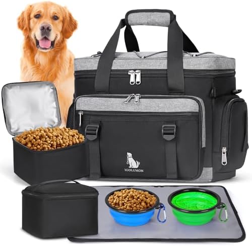 IGOLUMON Dog Travel Bag Large Pet Travel Bags Set for Supplies Weekend Travel Kit Tote Organizer Multi-Pockets Food Travel Bag with 2 Extra Large Food Containers, 2 Dog Bowls, 1 Feeding Mat