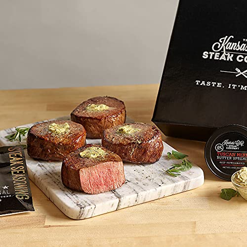 Premium Gift-boxed Butter-topped Super Trimmed™ Filet Mignon Steak in a beautiful black gift box with Tuscan Herb Finishing Butter and Cooking Instructions from Kansas City Steak Company