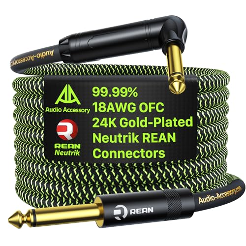 Pro Bass Guitar Cable 10 ft, Gold-Plated Neutrik REAN Connector, 18 AWG OFC, Braided 1/4 Inch Instrument Cable for Fender Electric Bass Guitar Combo Amp Rumble Marshall, Right Angle