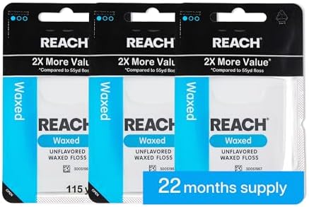 Keep your teeth clean and healthy with the REACH Waxed Dental Floss. This 3-pack bundle offers 115 yards of floss, providing 2X more value compared to standard 55yd floss. The unflavored and waxed coating allows the floss to slide smoothly between teeth, effectively removing plaque.
