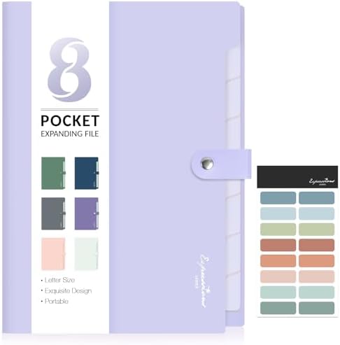 Sooez Elegant Accordion File Organizer with Labels, 8 Pocket Expanding File Folder, Portable Folders for Documents, Cute Paper Organizer for School Office Supplies, Letter Size, Light Purple
