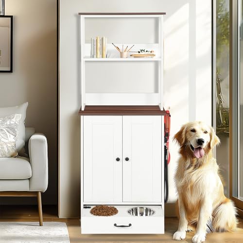 Thctvous Dog Food Cabinet with 2-Level Shelving, Dog Food Storage Cabinet with Bowls and Drawers, Pet Feeding Station with Adjustable Shelves and Hooks (White-2 Level Shelving)