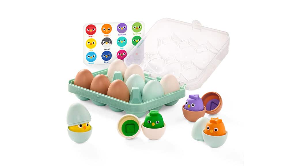 The Battat Sort & Match Eggs is an innovative playset aimed at children aged 18 months and above. Each of the twelve eggs in the set contains a colorful chick that represents a specific emotion. The range of emotions includes angry, happy, confused, surprised, silly, bashful, sad, annoyed, scared, sleepy, loved, and relaxed. The goal is for children to match each chick to its corresponding emotion, thereby promoting emotional intelligence from a young age.